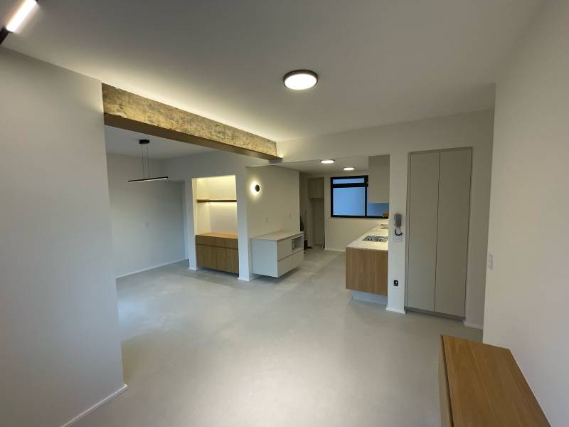 Sala ampla com piso em porcelanato acetinado e projeto luminotécnico moderno com luminárias modulares, integrada à varanda, garantindo excelente ventilação e iluminação natural.