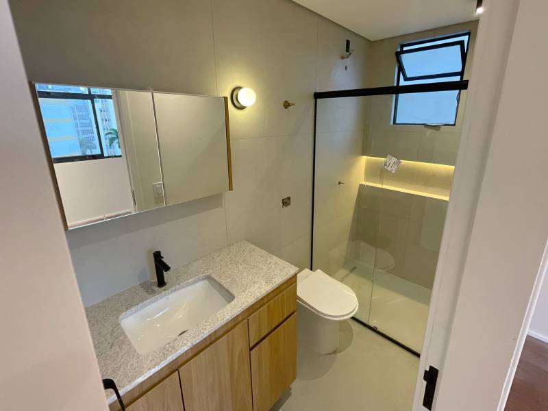 Banheiros (social e suíte) com nichos iluminados, marcenaria sob medida e louças e metais novos de alto padrão.